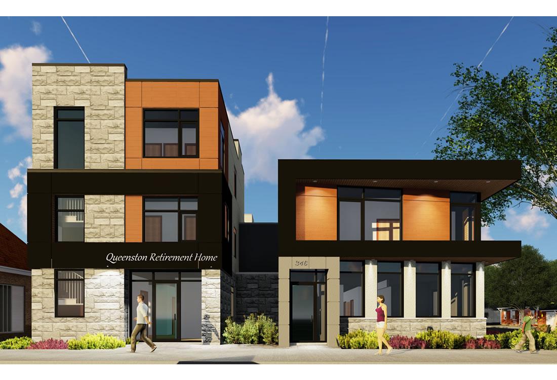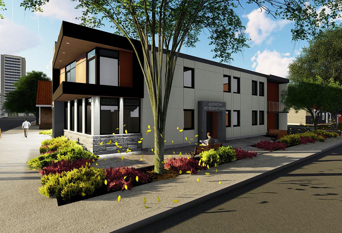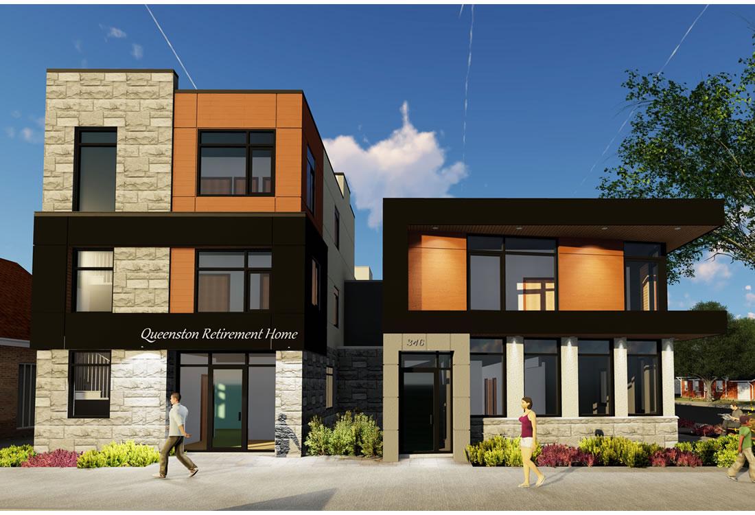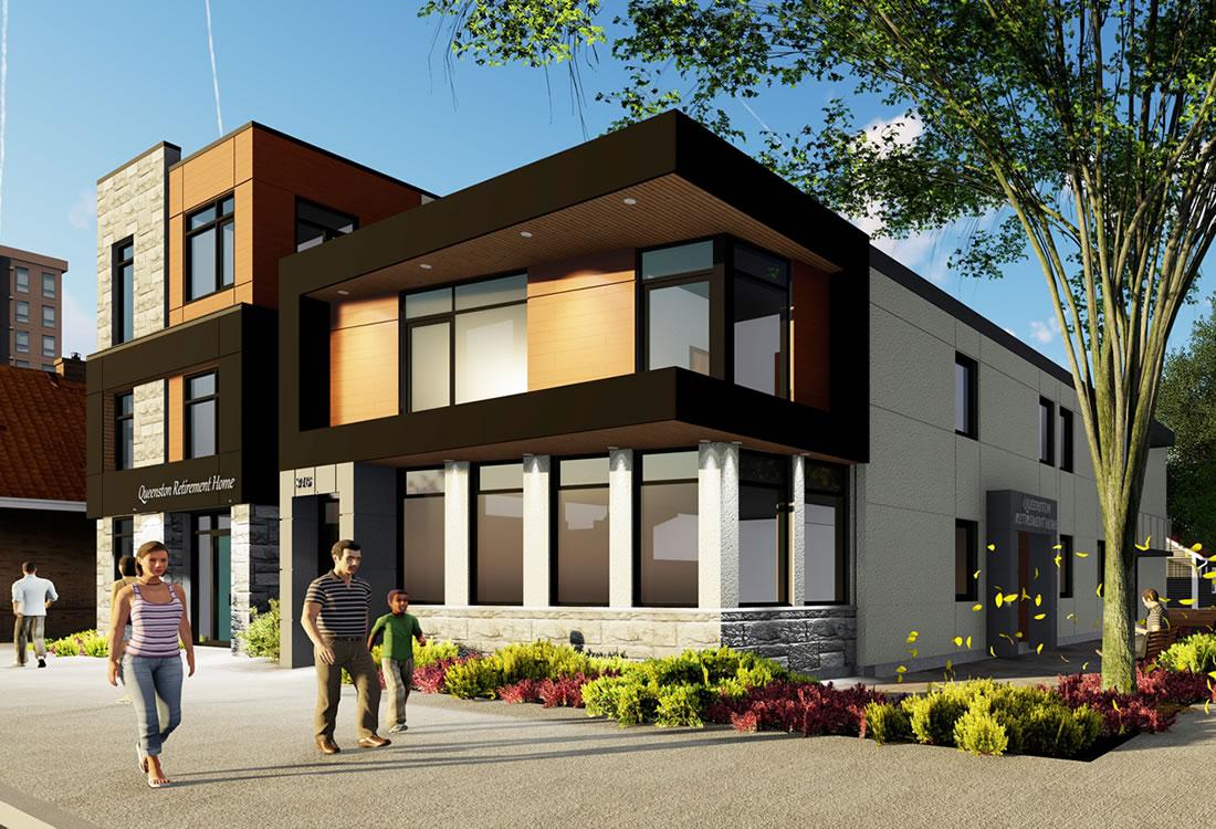 17 bedrooms with an area of 5,037 sq. ft. The scope of this project was to design a new retirement home building and renovate the existing one to have similar architectural design and features. The intent of the owner was to link the two buildings in order to create a larger retirement home. The design is modern in nature respecting the scale of the development.